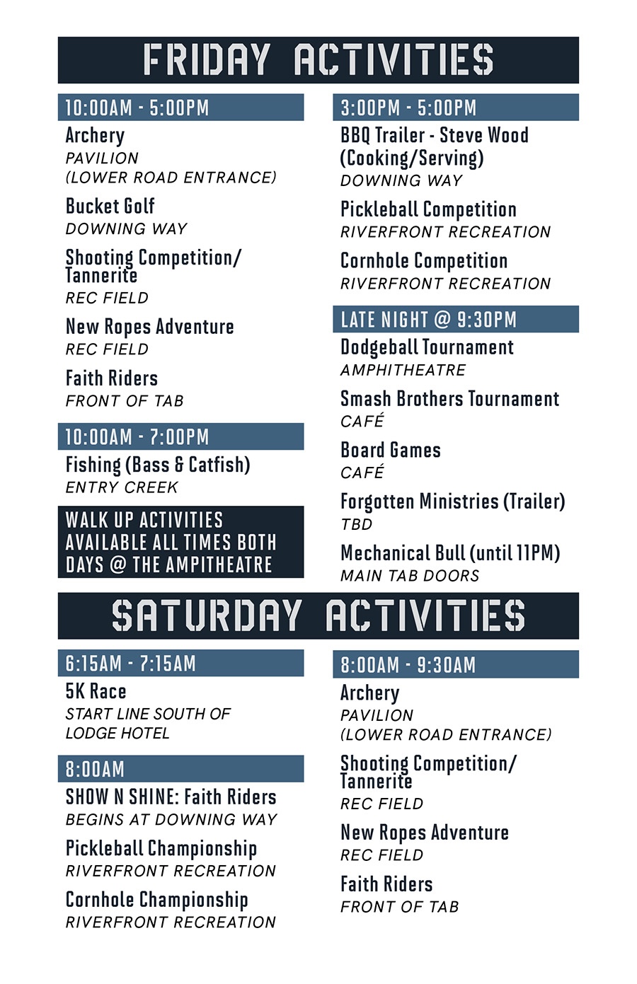 If arriving on Thursday you will need to have secured your own lodging rather it be in a cabin, Falls Creek Hotel, or a hotel in Davis as we do not provide lodging. Contact the cabin owner for the rental of beds at fallscreek.org. Contact Falls Creek at 580-369-2101 for a hotel room on the grounds. There will also be an additional $5 per person fee for arriving Thursday. Friday’s $5 per person fee is included in the amount when registering.