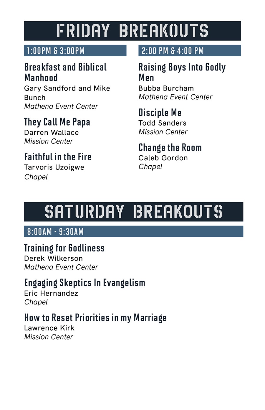 – All breakouts will be located in the Mathena Event Center (MEC), World Mission Center, or the Chapel.