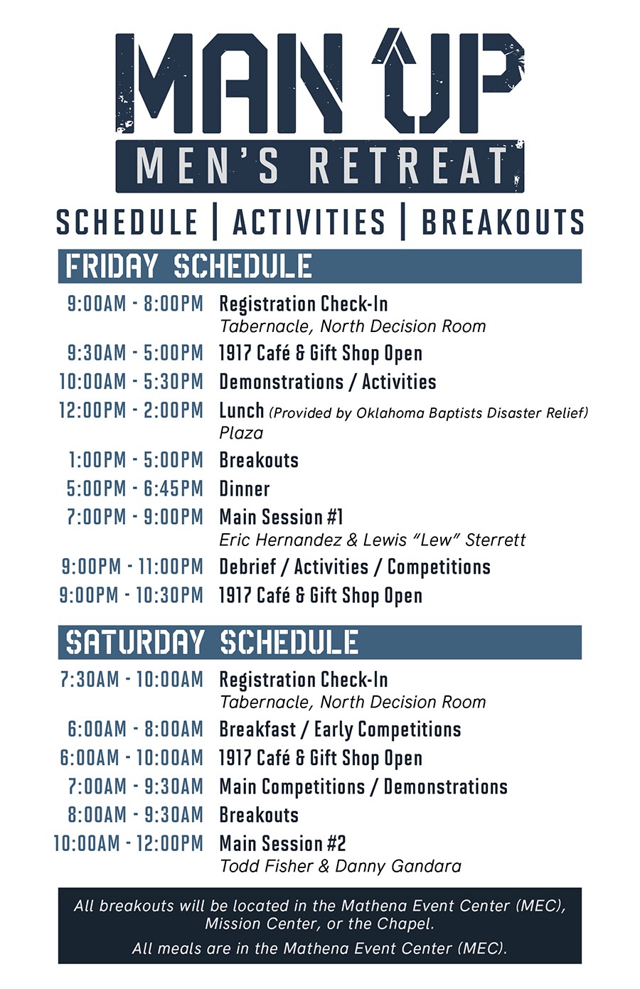 A: Registration is open between February and three weeks prior to the retreat. When registration opens, you will be able to register through our website www.oklahomabaptists.org/men/retreat.