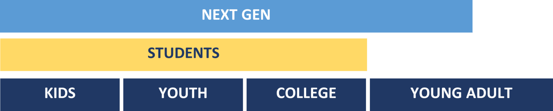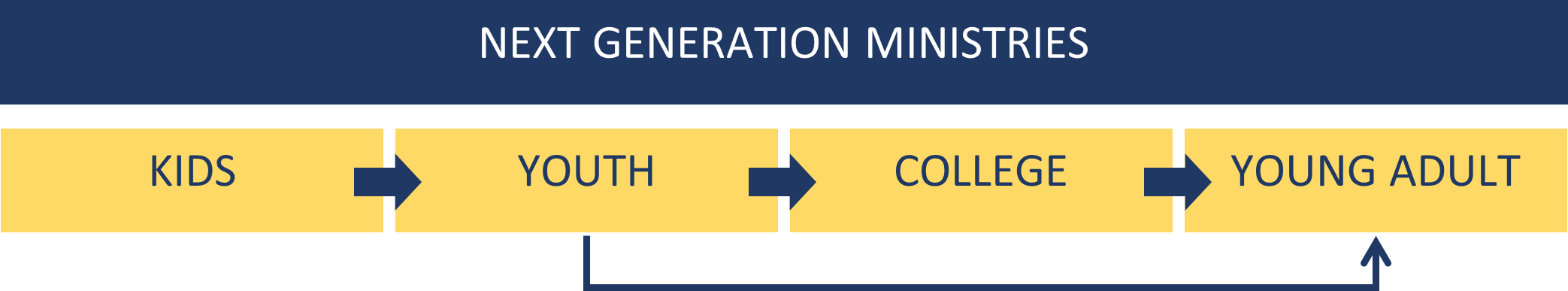 The goal of the next generation ministry strategy is to strategically unify ministry to now and next generations across ministry area boundaries to move members from childhood into healthy young adulthood.
